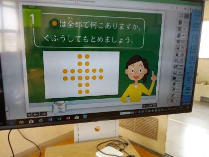 授業では3年生が、かけ算を使う問題に取り組んでいました。考え方を共有ながら、情報を活用する力をつけていました。