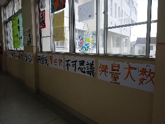 小学4年生が漢字で表す数字単位を毛筆書きして掲示しています。「一」「十」「百」「千」・・・・「不可思議」「無量大数」????一生使うことはないでしょうが、宇宙天文学的に漢字で表すとこうなるのでしょうね。