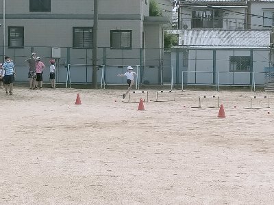 小学生のハードル走の様子です。走りながら、跳ぶという日常はなかなか無いので、皆最初は不器用な感じでしたが、すぐに慣れて元気に飛び跳ねていましたよ。