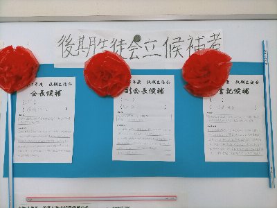 中学生の後期生徒会役員が決定の掲示版です。新役員の生徒たちには、立会演説会で公約した皆との約束を果たせるように頑張ってほしいと期待しています。認証式は10月11日、後期始業式に行われます。