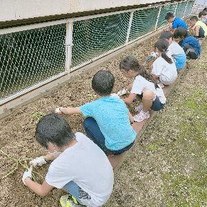 小学生が「いもほり」をしました。一斉に取り掛かって、あっという間にたくさんの立派な「いも」を収穫しました。ここまで成長するのに、学校事務員さんや管理作業員さんに大変お世話になりました。ありがとうございました。収穫した「いも」は本来なら焼き芋にして皆でいただくところですが、時節柄、学園に持って帰ってもらい料理していただくことにしました。