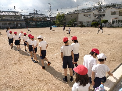 小学生がキックベースボール授業の初歩である、ベースランニングを練習していました。