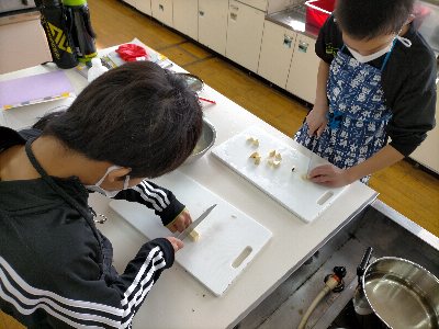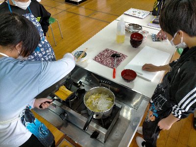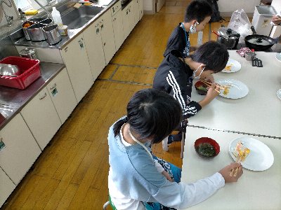 6年生が、味噌汁、卵料理に挑戦しました。最初は恐る恐るでしたが、少しずつ慣れてくると、上手に調理していました。みんなで食べて、とても美味しかったです!