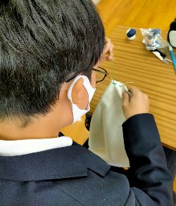 中学2年生が、針に糸を通しクロスステッチに挑戦していました。初めてでも、上手にできていました。