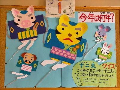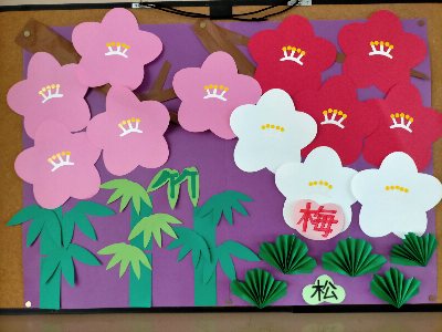 中学校は松竹梅、小学校は干支をモチーフにした掲示を、図書支援員の方が作って下さいました。年始は何かとおめでたい気分が掲示版からも伝わってきます。