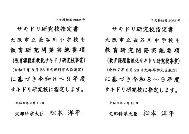 本校は2月20日(金)に、文部科学省・松本文部科学大臣 より、令和8~9年度 教育課程柔軟化サキドリ研究校に正式に指定を頂戴いたしました。すでに、中教審の次期学習指導要領「論点整理」の3つの方向性の「深い学びの実装」「多様性の包摂」「持続可能性の確保」に視座をおいて、小中の授業を5分短縮しうまれた「余白」の時間を活用して、児童・生徒が主体的に学習に取り組む「探究学習」を小中で展開しています。さらに4月より、その「余白」を活用して教職員の会議を職員室等で実施する予定で、働き方改革の視点からも実践研究を進めています。