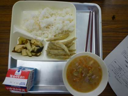 今日の給食は【きびなごてんぷら・わかたけ煮・豚汁・ごはん・牛乳】でした。