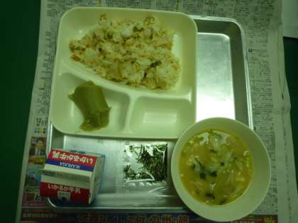 今日の給食は【かやくご飯・まっ茶ういろう・みそ汁・牛乳】でした。