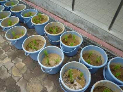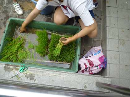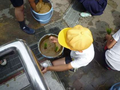 今日5年生は、地域の方から頂いた、稲の苗をバケツに植える作業をしました。秋にはお米がたくさん実るといいですね。