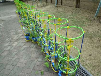 1年生が育てている朝顔の鉢に、弦が巻きついていくように支柱が取り付けられていました。