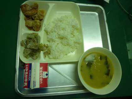 今日の給食は【鶏肉の甘辛焼き・キャベツの赤じそあえ・みそ汁・ごはん・牛乳】でした。