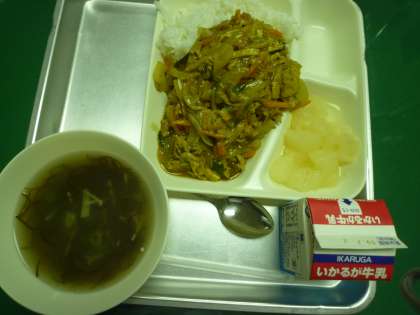 今日の給食は【和風カレー丼(ごはん)・もずくとオクラのとろり汁・和なし(カット缶)牛乳】でした。