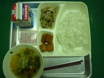 今日の給食は【ゴーヤチャンプルー・あつあげのしょうがじょうゆかけ・すまし汁・ごはん・牛乳】でした。