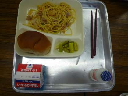 今日の給食は【ポークトマトスパゲッティ・グリーンアスパラのサラダ・発酵乳・パン(1/2)・牛乳】でした。