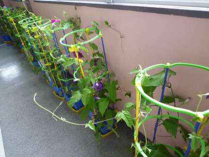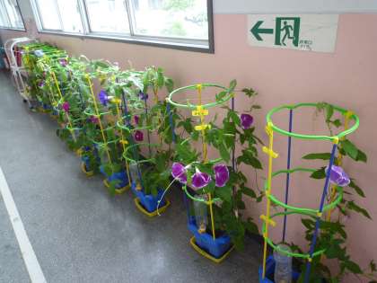 夏休みの間は、朝顔のお世話はおうちでするために、持って帰ります。そのために朝顔の鉢は、教室の前の廊下に移動されています。どの朝顔もとても大きく成長しています。1年生のみなさんが、毎日水やりをしてきたからですね。ご苦労様でした。夏休み中も、しっかりお世話してあげてくださいね
