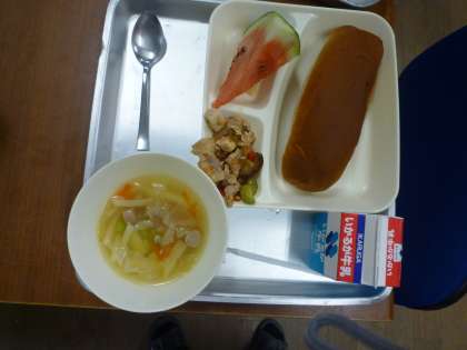 今日の給食は【鶏肉と夏野菜のソテー・押麦のスープ・すいか・パン・牛乳】でした。
