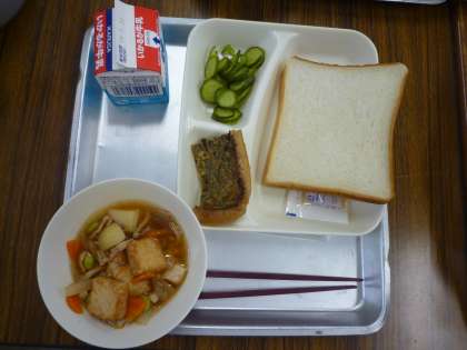 今日の給食は【もずく入りヒラヤーチー・豚肉といかの煮もの・あっさりきゅうり・りんごジャム・パン・牛乳】でした。
