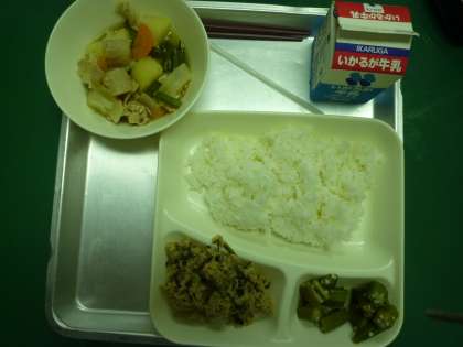 今日の給食は【豚肉とじゃがいもの煮もの・オクラの甘酢あえ・ツナっ葉いため・ごはん・牛乳】でした。今日で一学期の給食は終わりです。次は二学期の8月27日(火)です。調理員さん、一学期おいしい給食をありがとうございました。二学期もよろしくお願いします。