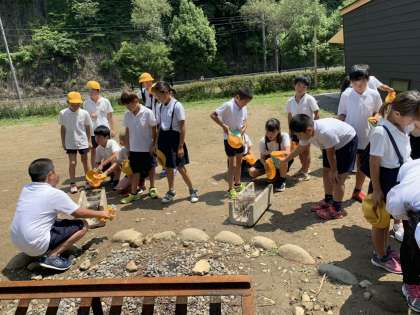 飯盒炊さんの準備として、小枝を集め、火おこし体験をしました。子どもたちは、煙がモクモクと立ち上がる中、力を合わせてがんばっていました。