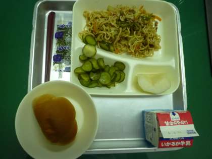 今日の給食は【焼きそば・きゅうりの甘酢づけ・なし(二十世紀)・パン・牛乳】でした。