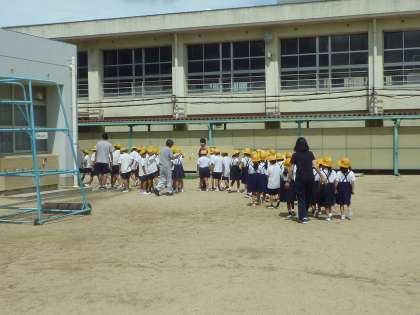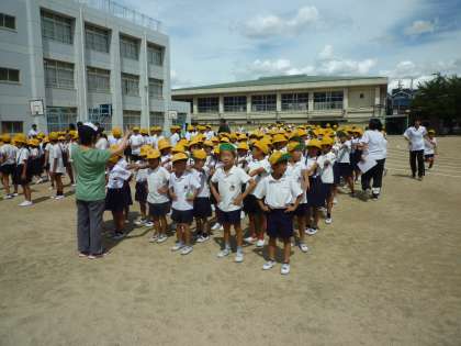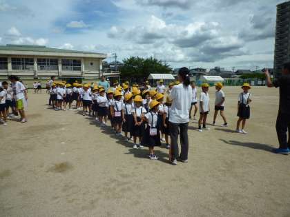 本日、喜連小学校では「地震・津波」に対する避難訓練を実施しました。写真は地震後に運動場に避難した時の様子です。この後、津波に備え校舎の3階以上の教室に避難する訓練が行われました。