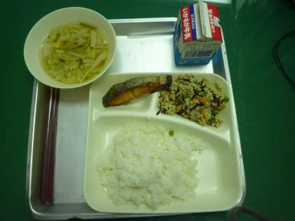 今日の給食は【さけのしょうゆ風味焼き・高野どうふのいり煮・五目汁・ごはん・牛乳】でした。