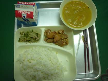 今日の給食は【鶏肉のてり焼き・野菜いため・みそ汁・ごはん・牛乳】でした。