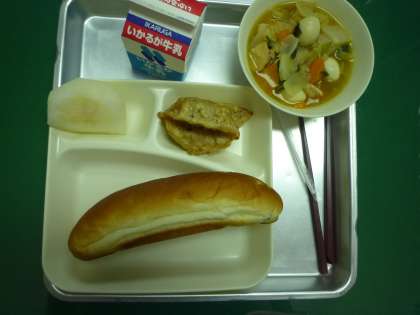 今日の給食は【あげぎょうざ・中華煮・なし(豊水)・パン・牛乳】でした。