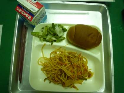 今日の給食は【イタリアンスパゲッティ・グリーンアスパラガスとキャベツのサラダ・パン・牛乳】でした。
