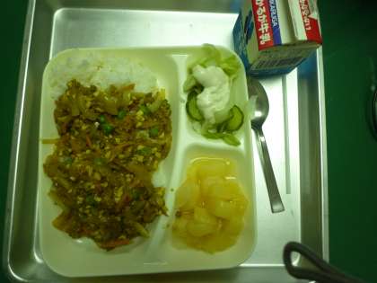 今日の給食は【大豆入りキーマカレーライス[米粉](ごはん)・グリーンサラダ(ノンエッグドレッシング)・白桃(カット缶)・牛乳】でした。