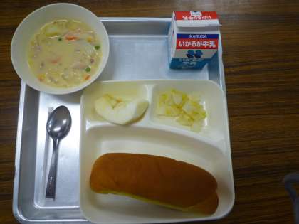 今日の給食は【コーンクリームシチュー(米粉)・はくさいのピクルス・りんご・パン・牛乳】でした。