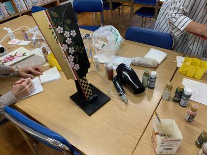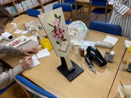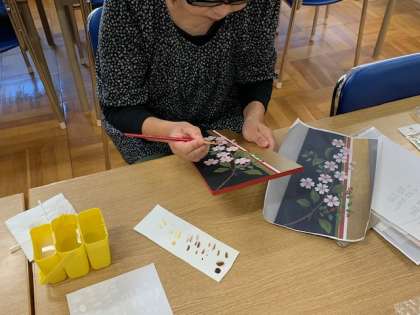 羽子板のトールペイントをしています。丁寧に色を付けていきます。