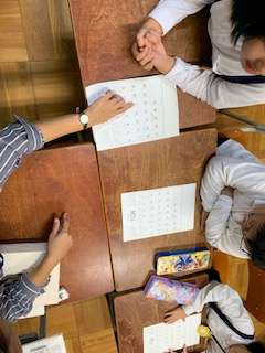 外国から転入してきた友だちが月に2回程度、指導してくれる先生に来ていただき、日本語の勉強をします。今日で3回目、元気いっぱいに頑張っています。