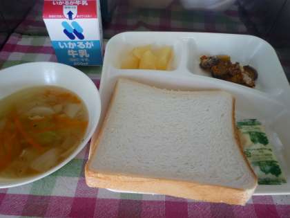 今日の給食は【なすのミートグラタン・鶏肉と野菜のスープ・白桃(カット缶)・ソフトマーガリン・パン・牛乳】でした。