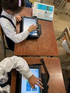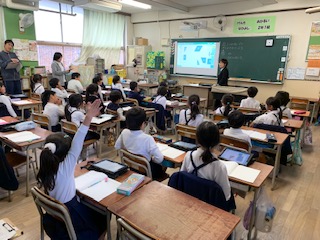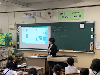 今日は、2年1組で研究授業が行われました。算数の図形の学習をしました。タブレットを使い、取り組んでいました。
