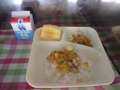 今日の給食は【中華丼(ごはん)・もやしの中華あえ・りんご・牛乳】でした。ごちそうさまでした。