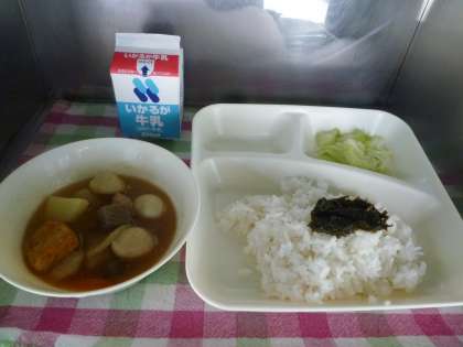 今日の給食は【関東煮・あっさりキャベツ・のりのつくだ煮・ごはん・牛乳】でした。ごちそうさまでした。
