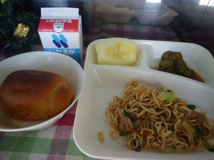 今日の給食は【オイスターソース焼きそば・きゅうりの中華あえ・りんご・パン(1/2)・牛乳】でした。ごちそうさまでした。