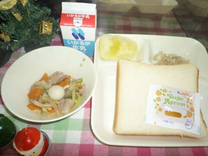 今日の給食は【八宝菜・もやしのごま酢あえ・りんご・アプリコットジャム・パン(基本配合)・牛乳】でした。ごちそあさまでした。