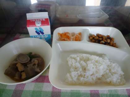 今日の給食は【筑前煮・ひじき豆・紅白なます・ごはん・牛乳】でした。ごちそうさまでした。