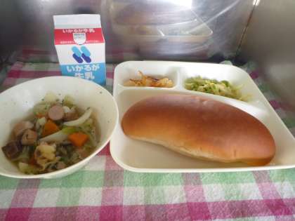 今日の給食は【ポトフ・カレーソテー・桃のクラフティ・パン(基本配合以外)・牛乳】でした。ごちそうさまでした。