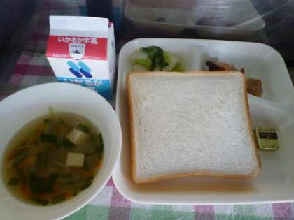 今日の給食は【鶏肉のオイスターソース焼き・チンゲンサイのピリ辛あえ・えびととうふのスープ(個別対応献立えび)・パン(基本配合)・牛乳】でした。ごちそうさまでした。
