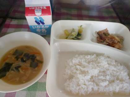 今日の給食は【豚肉のごまだれ焼き・みそ汁・きくなとはくさいのおひたし・ごはん・牛乳】でした。ごちそうさまでした。