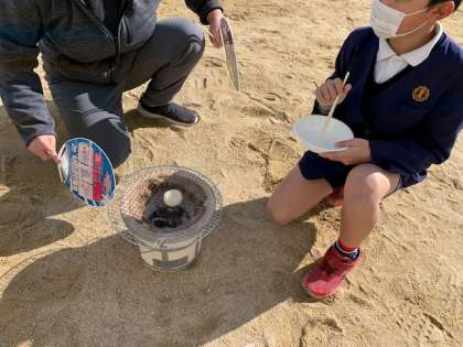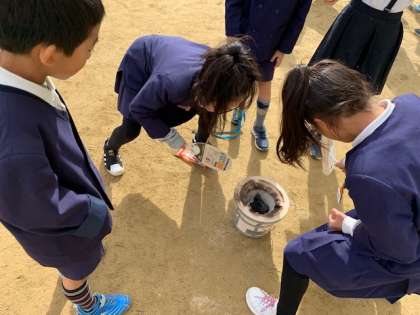 各班に分かれ、炭に火をつけるため一生懸命うちわで仰ぎます。でもなかなか火がつきません。着火剤を使ってみました。すぐ仰ぐと火が消えてしまいます。