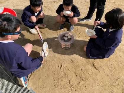 なんとか火がつき、あみに餅をのせて焼いていきます。火が強すぎると焦げてしまいます。火加減が難しいです。出来上がったお餅を美味しそうに食べていました。