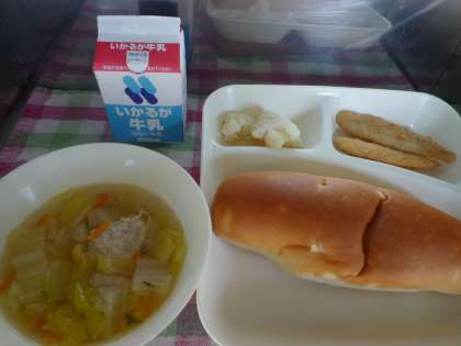 今日の給食は【わかさぎフライ・はくさいのスープ・カリフラワーのサラダ・パン(基本配合以外)・牛乳】でした。ごちそうさまでした。
