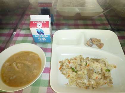 今日の給食は【鶏ごぼうご飯(ごはん 減量)・みそ汁・焼きれんこん・牛乳】でした。ごちそうさまでした。