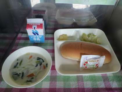 今日の給食は【ほうれんそうのクリームシチュー・キャベツのサラダ・洋なし(カット缶)・りんごジャム・パン(基本配合)・牛乳】でした。ごちそうさまでした。