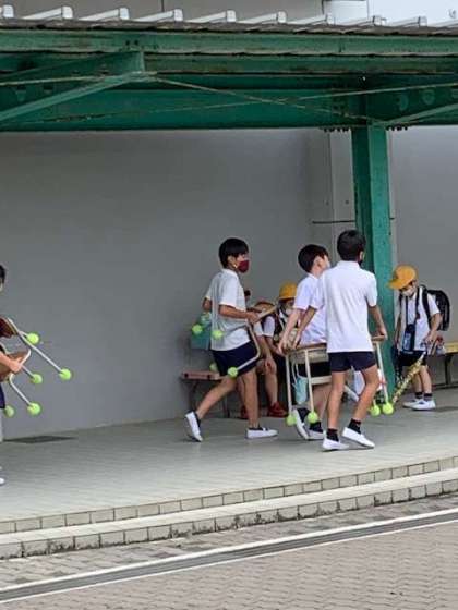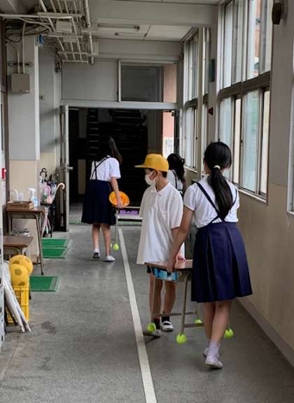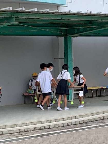 5、6年生のみんなで1年生の机と椅子を移動しています。