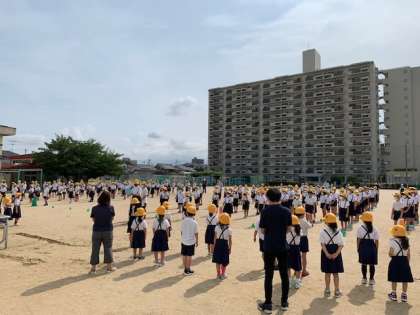 今日、児童朝会で「1年生を迎える会」を行いました。6年生の代表のお姉さんとお兄さんから「お迎えのことば」があり、2年生から6年生で1年生をお迎えしました。
